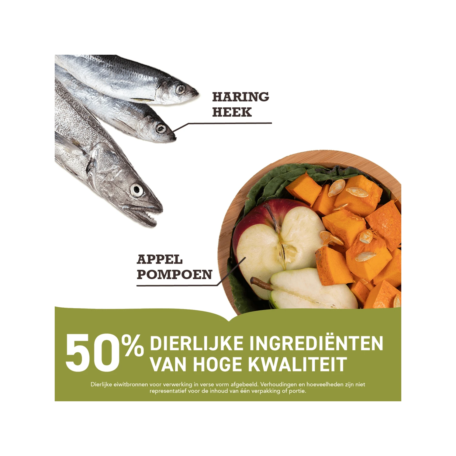 Rauwe zalm (22 %), gedroogde haring (19 %), parelgort, hele erwten, havergrutten, varkensvet (8 %), hele haver, kikkererwtenvezel, visolie (1 %), calciumcarbonaat, kaliumchloride, gedroogde kelp, zout, gedroogde cichoreiwortel, verse hele pompoen, verse hele flespompoen, verse hele wortels, verse hele appels, verse hele peren, verse hele courgette, verse boerenkool, verse spinazie, verse raapstelen, vers bietenloof, hele veenbessen, hele bosbessen, hele Saskatoon-bessen, kurkuma, mariadistel, kliswortel, lavendel, heemstwortel, rozenbottels.