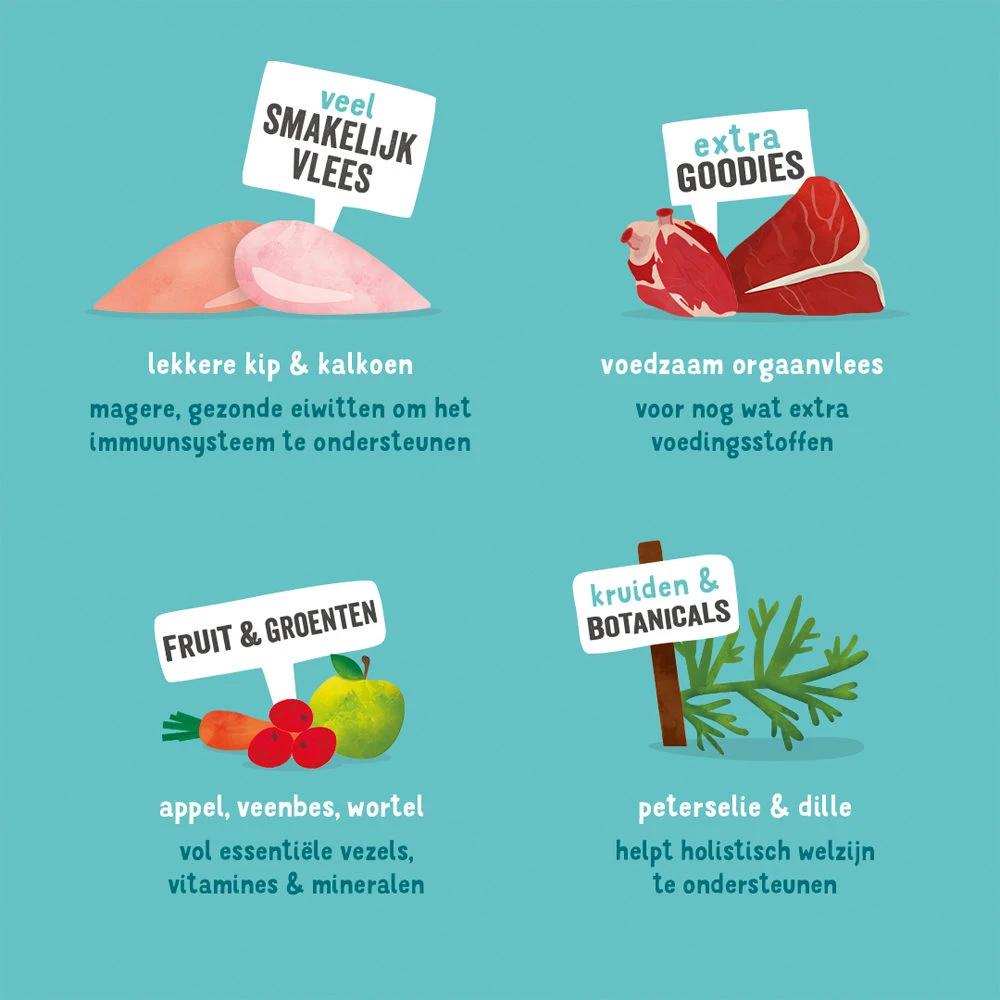 Kip 30%, kalkoen 26%, mineralen, wortels 2%, cranberry’s 1%, tomaten 1%, pompoen 1%, appels 1%, peterselie 0,1% en dille 0,1%.