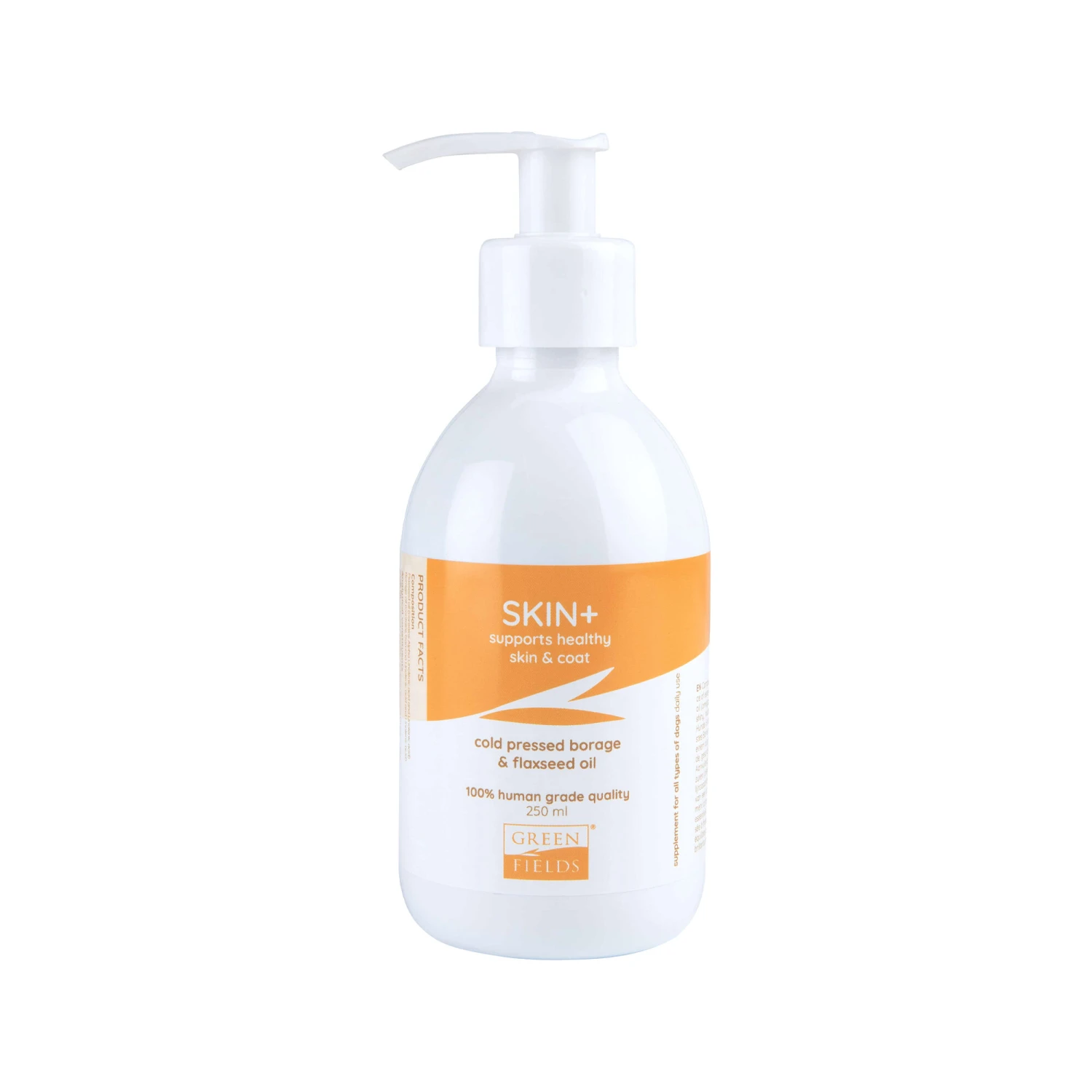 De Greenfields Skin+ is een olie die wonderen doet voor de gezondheid van de vacht en huid van uw hond. Veel hondeneigenaren komen bij de dierenarts langs omdat hun hond last heeft van schilfers, jeuk, droogte of irritatie. In veel gevallen kunnen deze klachten voorkomen worden door de juiste voedingssupplementen. Heeft uw hond een gevoelige huid? Voeg dan Greenfields Skin+ toe aan zijn maaltijd. Deze samenstelling bestaat uit 100% natuurlijk ingrediënten, namelijk borage olie en lijnzaadolie. Doordat beide ingrediënten erg sterk geconcentreerd zijn, is de olie heel duurzaam in gebruik. Lijnzaadolie werkt als een bron van omega 3 vetzuren en borage olie als een bron van omega 6.