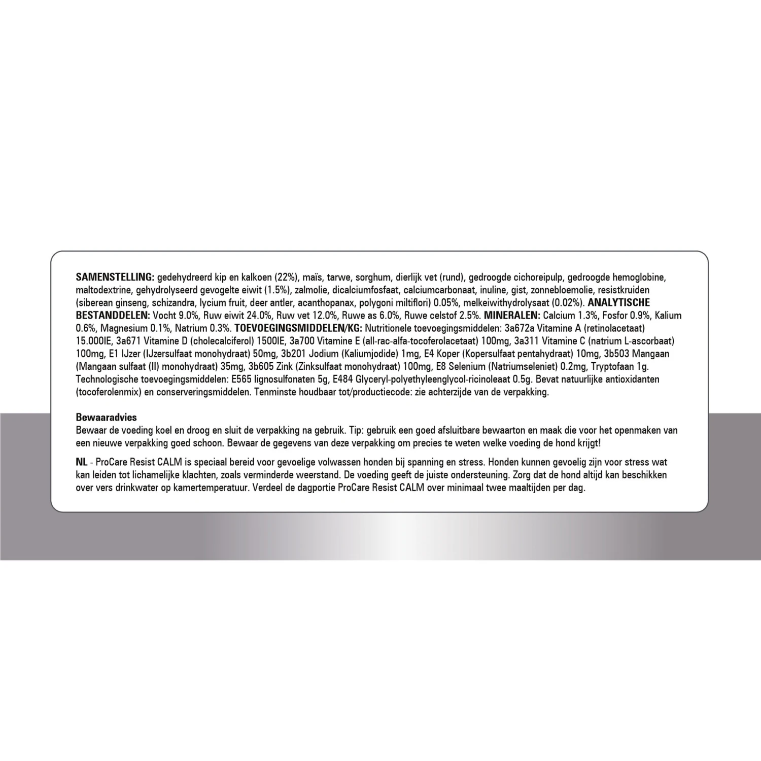 Prins ProCare Resist Calm is een speciaal samengestelde droogvoeding van geperste brokken. Deze voeding met kruidenextracten is geschikt voor volwassen honden vanaf 1 jaar met een verminderde weerstand. Honden kunnen een verminderde weerstand krijgen bij ziekte of herstel na een operatie, door spanningen of hormonale schommelingen. ProCare Resist Calm van Prins bevat gehydrolyseerd melkeiwit en tryptofaan, die bijdraagt aan het evenwichtig houden van uw hond in spannende situaties. Daarnaast zijn er ook kruidenextracten toegevoegd die een rustgevend gevoel geven. ProCare Resist Calm is rijk aan vitaminen en mineralen, waaronder vitamine C en D, zink en selenium die het immuunsysteem ondersteunen.