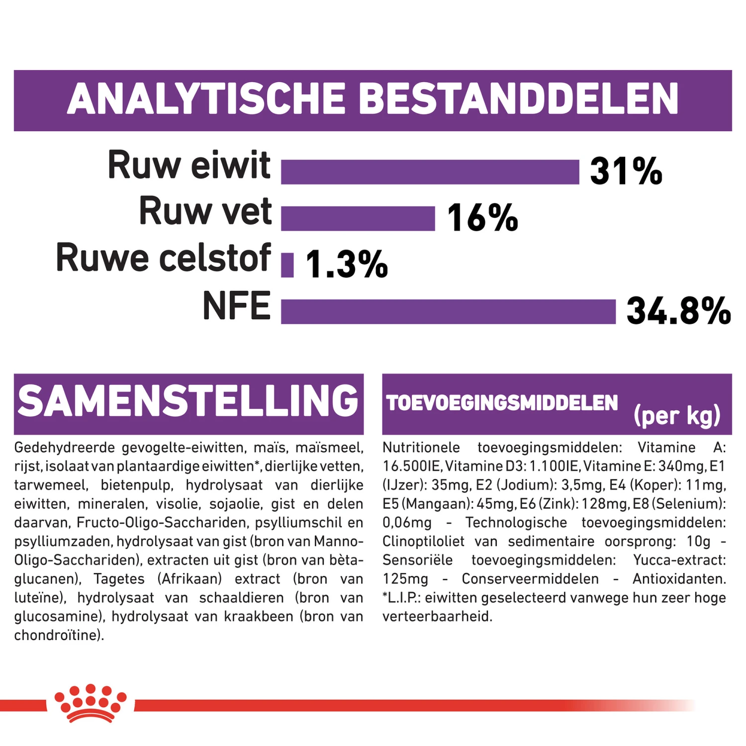Gedehydreerde gevogelte-eiwitten, maïs, maïsmeel, rijst, dierlijke vetten, tarwegluten*, tarwemeel, bietenpulp, gehydrolyseerde dierlijke eiwitten, mineralen, sojaolie, gistproducten, visolie, fructo-oligosacchariden, psylliumschil en psylliumzaden, gehydrolyseerd gist (bron van manno-oligosacchariden en bèta-glucanen) (0,30%), algenolie Schizochytrium sp. (bron van DHA), sap van Yucca schidigera, tagetes meel, glucosamine uit gisting, gehydrolyseerd kraakbeen (bron van chondroïtine)